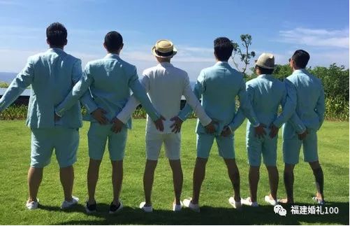 喜欢同色系的西装,建议新郎选择偏深或偏浅的颜色,伴郎们的颜色可以变化一个度或者用暗纹来区分,整体的和谐度也是超级高的。